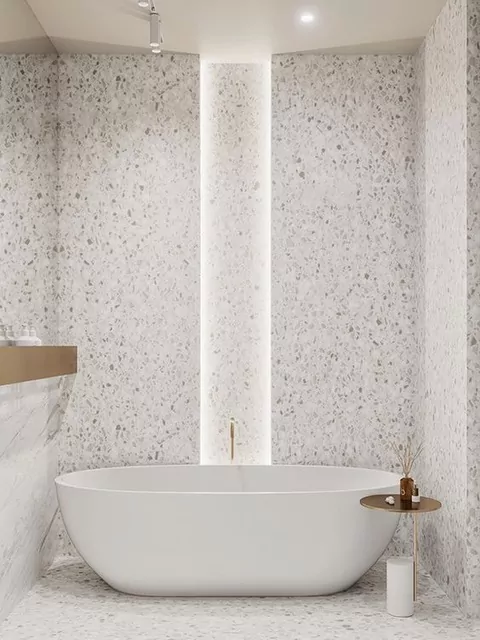 Grâce à ses caractéristiques robuste, le Terrazzo est un matériau idéal pour les salles de bain, que ce soit en grande utilisation dans une douche ou une simple vasque.